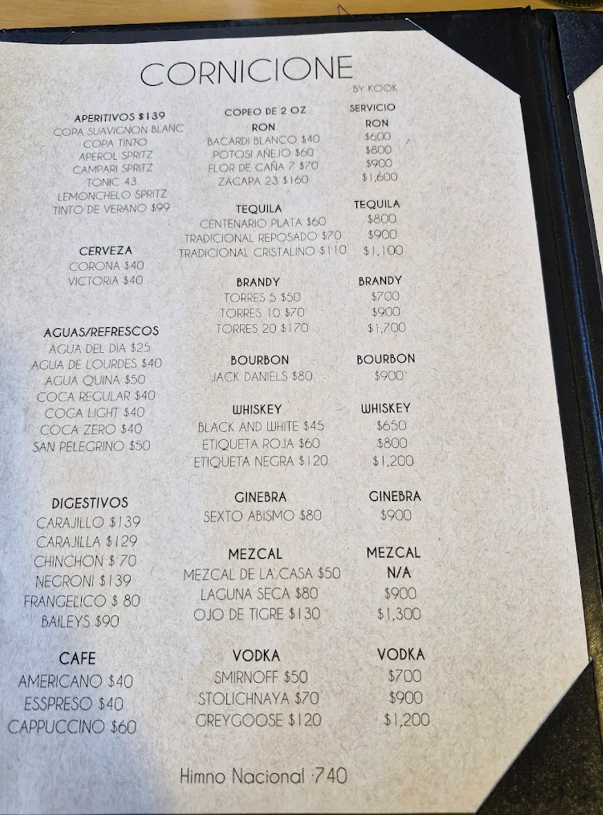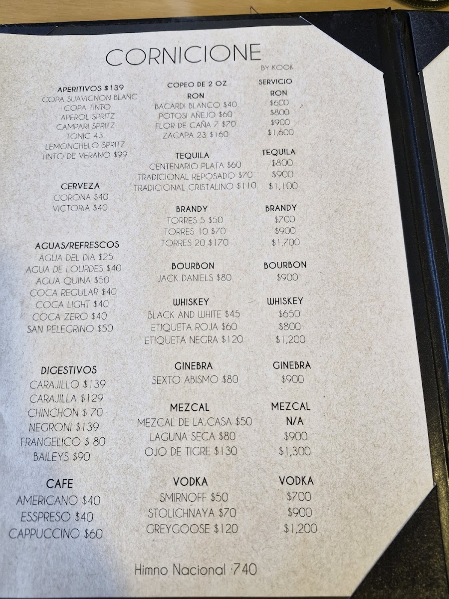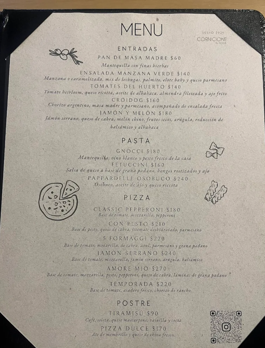 The menu at Cornicione By Kook offers a variety of well-crafted dishes that cater to a range of tastes. For pasta lovers, there's Fettuccini, Gnocci, and the classic Lasagna Ragu. For a light start, diners can enjoy Jamón Y Melón, Ensalada De Manzana Verde, or the freshly baked Pan De Masa Madre. As for beverages, the selection includes refreshing options like Boing Mango 354 Ml, Coca-Cola Original 355 Ml, Coca-Cola Zero 350 Ml, and Agua De Lourdes Mineral 355 Ml. The pizza section is a highlight with options like the indulgent Pizza 5 Formaggi, the savory Pizza De Jamón Serrano, and the crowd-favorite Pizza FoodiesMx. The Pizza Classic Peperoni is another delicious choice for those craving a classic. The menu at Cornicione By Kook offers something for everyone, with quality ingredients and a delightful mix of traditional and unique flavors.